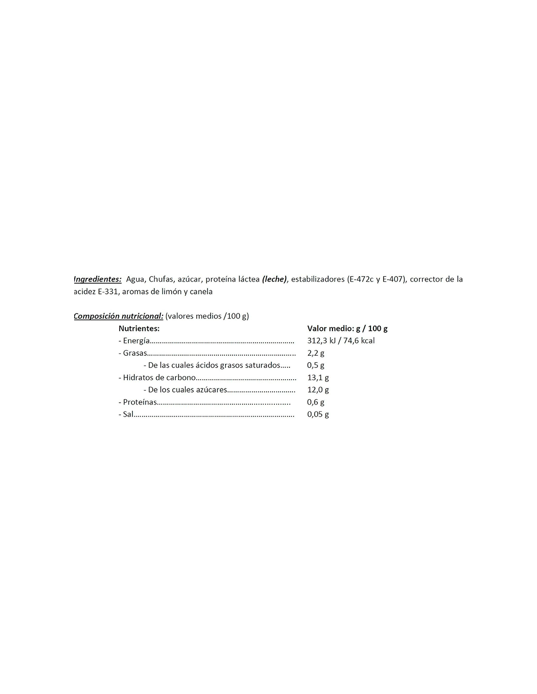 Con una concentración de 2,2 mg, logra un equilibrio ideal entre cuerpo y frescura. No resulta pesada, pero sí sabrosa, perfecta para quienes valoran una horchata bien hecha. Cada botella incluye el clásico polo de madera, no como simple adorno, sino como parte esencial de la experiencia tradicional.