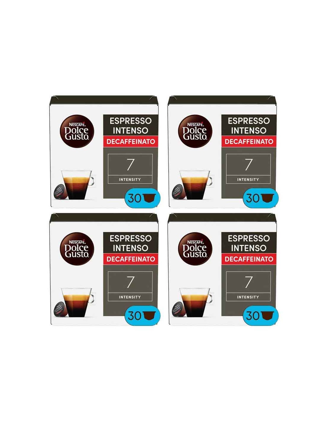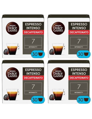Con este pack ahorro de 4 cajas de 30 cápsulas, tienes a tu alcance 120 cápsulas del exquisito Descafeinado Espresso Intenso de NESCAFÉ® Dolce Gusto®, un café que destaca por su cuerpo, intensidad y sabor, pero con un bajo contenido en cafeína. Perfecto para cualquier momento del día.